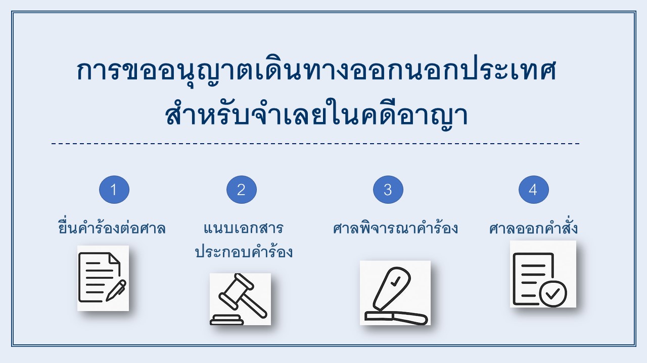 - ยื่นคำร้องต่อศาล จำเลยหรือทนายความต้องจัดทำคำร้องเพื่อขออนุญาตเดินทางออกนอกประเทศ ระบุเหตุผลที่จำเป็น เช่น การรักษาพยาบาล การเรียน การทำงาน หรือธุรกิจสำคัญ